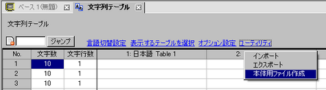 文字列テーブルの入力が完了したら、[ユーティリティ]から[本体用ファイル作成]を選択します。
