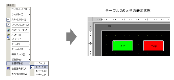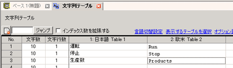 文字列テーブルを切り替えた場合の表示状態を確認するには、[表示(V)]メニューの[言語切替(L)]で、[テーブル2]を選択します。