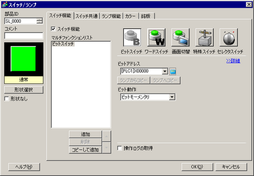 配置したスイッチをダブルクリックすると、設定ダイアログボックスが開きます。