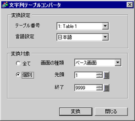 [文字列テーブルコンバータ]ダイアログボックスが表示されるので、変換先のテーブル番号と変換対象を選択します。(例 : [変換テーブル番号]1: Table 1、[変換対象]個別)
