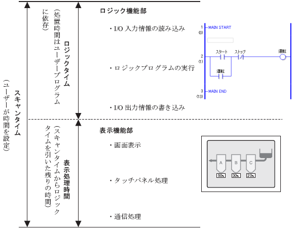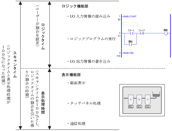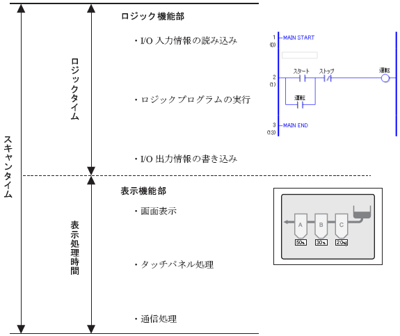 ロジックのスキャンタイムはロジックプログラムを実行するロジック機能部と表示機能部(画面表示、タッチパネル処理、通信処理)が含まれ下図のようになっています。
