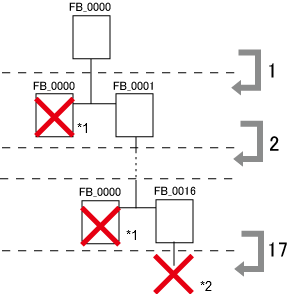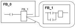 ファンクションブロック(FB)のプログラム内で別のFBを命令として使うことをFBのネストと呼びます。FBのネストは16階層まで使うことができます。ただし、再起呼出し(ネストの中で自分自身を命令として使うこと)はできません。