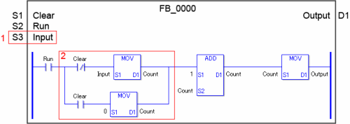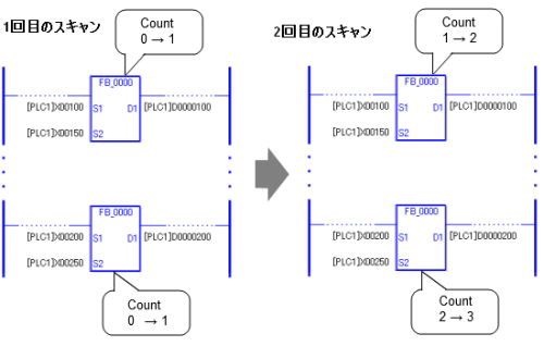 例えば、命令が導通するたびに1ずつカウントアップするファンクションブロック(FB_0000)を用意し、ロジック画面でFB_0000を2回配置している場合を考えます。1回目のスキャンでは、1つ目のFB_0000と2つ目のFB_0000の両方とも「Count」(ローカル変数)を初期化してから加算するためにS1オペランド、S2オペランドの両方をONします。2回目以降のスキャンでは加算だけを行うためS2オペランドのみをONにします。