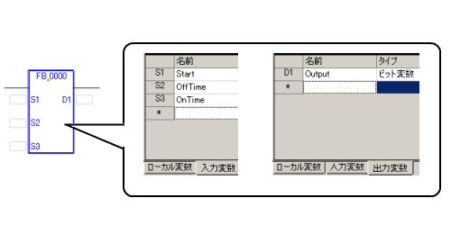 入力変数、出力変数はFBとそれを使っているロジックプログラムとのデータの受け渡しをする変数です。FBをロジック画面に挿入すると、FB内で作成した入力変数がSオペランドとして、出力変数がDオペランドとして表示されます。
