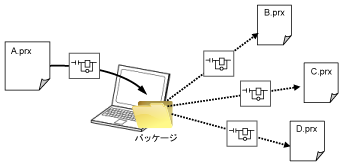 ロジックプログラムの一部をパッケージに登録することができます。パッケージ登録したロジックプログラムはドラッグ&ドロップでロジック画面へ配置することができ、プロジェクトをまたいで再利用することができます。