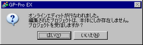 オンラインエディットは表示器内にあるロジックプログラムをパソコン上から編集しているため、編集した内容はパソコン内のプロジェクトファイル(*.prx)には反映されていません。オンラインエディット後、オンラインモニタ終了時に次のダイアログボックスが表示されますので、編集内容をパソコン内のプロジェクトファイルに反映する場合は [はい]、反映しない場合は[いいえ]をクリックしてください。