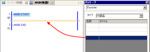 パッケージから行部品を選択し、ロジック画面へドラッグ&ドロップで配置します。