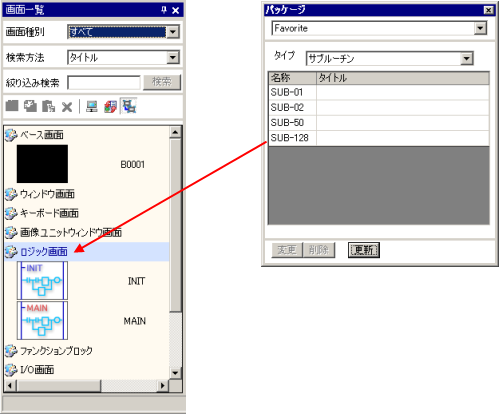 画面一覧ウィンドウに登録されたサブルーチンをロジック画面上に配置します。