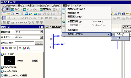 ラダー方式とIL方式の表示切替は、[画面]メニューから[画面表示切替]の[IL]をクリックします。