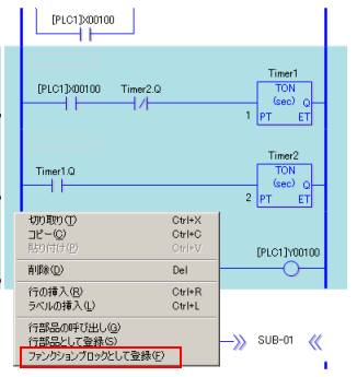 ロジック画面でFBとして登録したい行を選択し、右クリックメニューの[ファンクションブロックとして登録]を選択します。