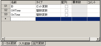 変数一覧の[入力変数]タブを開き、ON時間、OFF時間を受け取るための変数を2つ作成します。(例: 名前「OffTime」と「OnTime」の整数変数を作成)