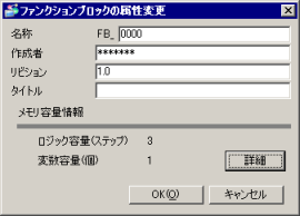表示された[ファンクションブロックの属性変更]ダイアログボックスで[名称]、[作成者]、[リビジョン]や[タイトル]を編集します。