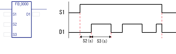 このFBは特定のビット(S1オペランド)がONしている間、指定された時間でOFFとONを繰り返すフリッカ信号を出力します。