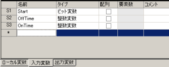 ファンクションブロック画面の変数一覧で[入力変数]タブを選択し、ビット変数を1つと整数変数を2つ登録します。これがFBの入力オペランド(S1からS3)になります。(例:名前に「Start」と入力し、タイプで「ビット変数」を選択)