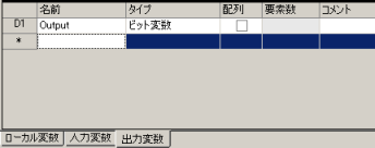 ファンクションブロック画面の変数一覧で[出力変数]タブを選択し、ビット変数を1つ登録します。これがFBの出力オペランド(D1)になります。(例:名前に「Output」と入力し、タイプで「ビット変数」を選択)