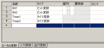 ファンクションブロック画面の変数一覧で[ローカル変数]タブを選択し、ビット変数を2つとタイマ変数を2つ登録します。これらはFB内でのみ使う変数です。(例:名前に「Bit1」と入力し、タイプで「ビット変数」を選択)