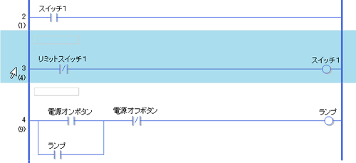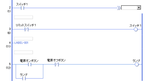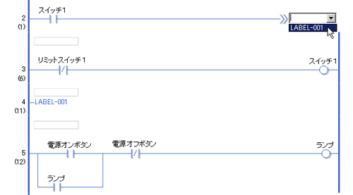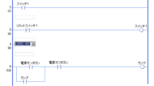 ここでは、例としてジャンプ先のラベル[LABEL-001]を挿入して、2行目の「スイッチ1」がONになったときにJMP命令で3行目をジャンプさせます。