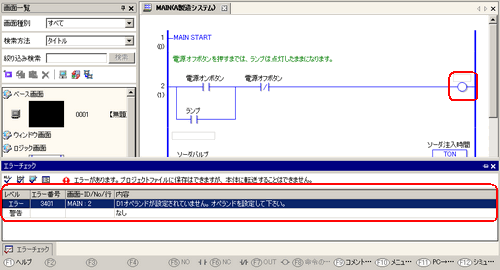 ロジック画面を表示し各エラーの行を選択すると、ロジックプログラムの該当箇所が選択されるので、エラー修正の際に便利です。