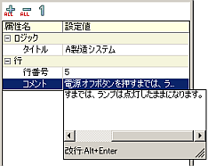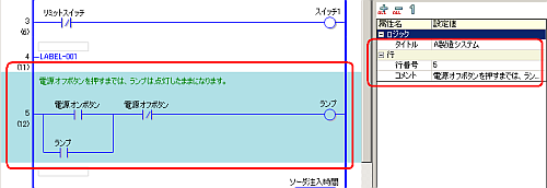 ロジックプログラム内の行を選択すると、選択した行の[行番号]と[コメント]が表示されます。