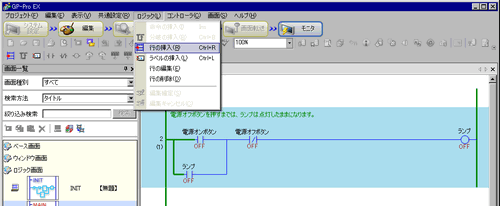 行の挿入は、選択した行の1行下に挿入されます。オンラインモニタの状態で挿入場所の行を選択して、[ロジック]メニューから[行の挿入]を選択します。