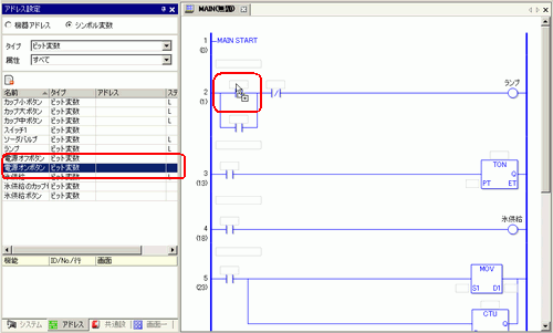 [タイプ]が[ビット変数]のシンボル変数のみが表示されます。一覧から[電源オンボタン]をクリックし、マウスの左ボタンを押したまま割り付けたい命令のオペランド部分までドラッグします。