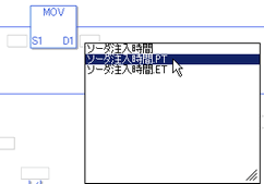 変数のタイプが[ビット変数]、[整数変数]、[フロート変数]、[リアル変数]で[配列]が設定されている場合や、複数の専用変数で構成されている[タイマ変数]、[カウンタ変数]、[時刻変数]、[日付変数]、[PID変数]の場合は、候補が表示されます。表示された候補の中から選択してください。