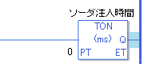 ここでは、例としてTON命令(オンディレータイマ)のオペランドの設定手順について説明します。1つのオペランドにシンボル変数「ソーダ注入時間」を割り付け、もう1つのオペランドにはタイマ出力(Q)がONになるまでの設定時間[設定時間(PT)]を割り付けます。