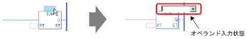 TON命令(オンディレータイマ)のオペランド部分をダブルクリックします。テキストボックスが表示され、オペランド入力待機状態になります。