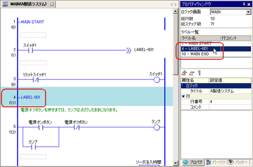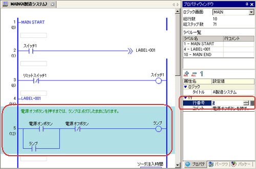 [行番号]をクリックして入力すると、ロジックプログラム内の行にカーソルが移動します。