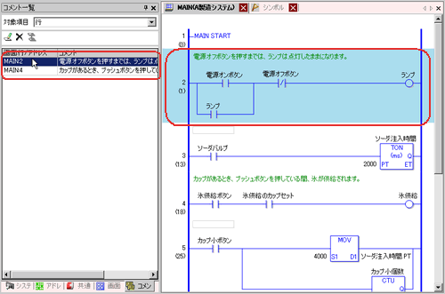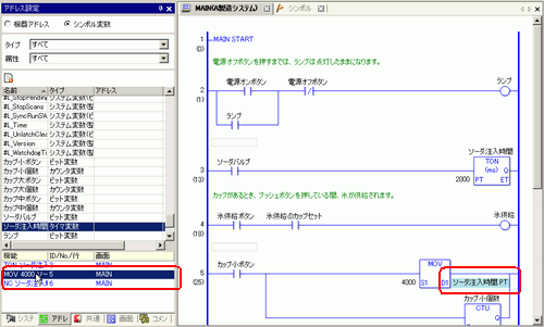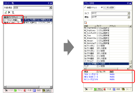 [アドレス設定]ウィンドウの下部ウィンドウを選択すると、ロジック画面の対象変数が選択されます。