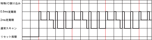例えば、2ms定周期処理が実行されている最中に特殊I/O割り込み処理を実行する場合は、2ms定周期処理を中断して特殊I/O割り込み処理を実行します。