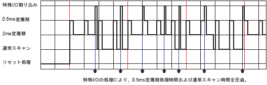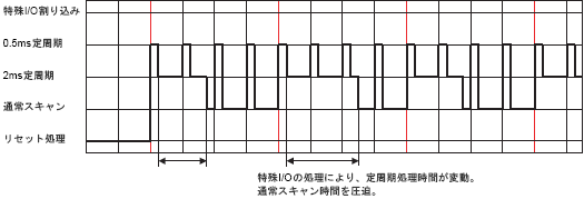 特殊I/O割り込みが発生する特殊I/Oを使用すると、任意のタイミングで特殊I/O割り込み処理を実行します。特殊I/O割り込み処理は、その他すべての処理時間を圧迫するため、その他の処理時間も増加します。