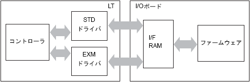 I/Oボードは、下記のブロック図のようにLTから制御指令を行うことにより各種I/Oの制御を行います。指令やI/Oボード側の情報はすべてI/F RAMにて受け渡しされます。