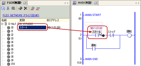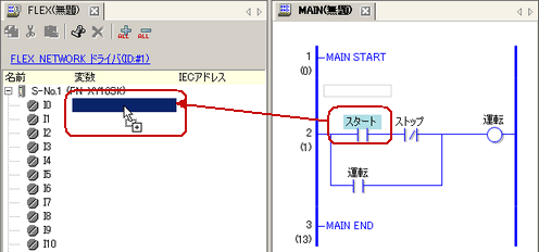 I/O画面の各I/O端子のアドレスをロジックプログラムの命令のオペランド部分にドラッグ&ドロップして、割り付けることができます。