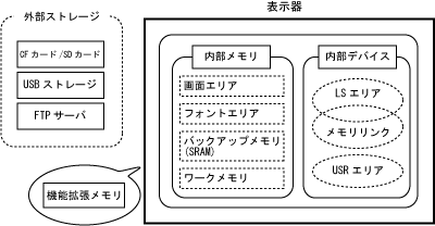 作成した画面や各機能で作成/取得したデータが保存されます。表示器の機種により各保存領域の容量は異なります。