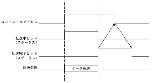 データ転送終了後は、ステータスのビット1(転送完了ビット)がONします。接続機器(PLCなど)で転送完了ビットONを検出してコントロールアドレスのビットをOFF してください。OFFすると自動的にステータスの転送完了ビットがOFFされます。