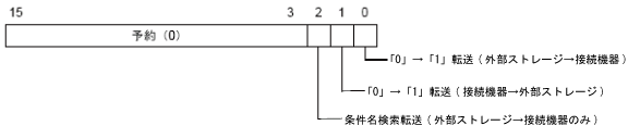 転送したいファイル数とファイル番号を指定して、[コントロールワードアドレス]のビット0をONすると、外部ストレージ内のCSVデータを[条件設定]で指定した条件に従って接続機器(PLCなど)に書き込みます。またビット1をONすると、接続機器(PLCなど)のデータを[条件設定]に従って外部ストレージに保存します。
