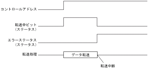 転送に失敗した場合は、転送中ビットがOFFし、エラーステータス(ステータスのビット12~15)にエラーコードがセットされます。コントロールアドレス、ステータスのビットをすべて「0」に戻してから次の転送を行ってください。