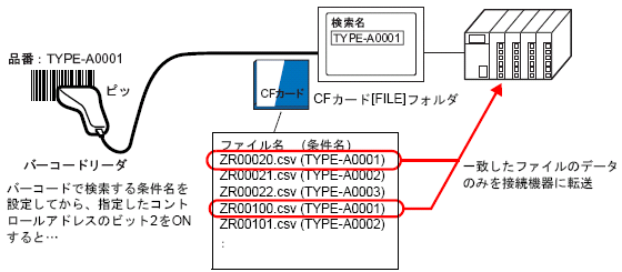 下図の例では、バーコードリーダから読み込んだ品番を条件名として、これと一致するCFカード内のファイル(CSVデータ)を接続機器に転送しています。