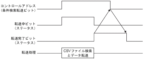 ビット2をONすると、[検索用ワードアドレス]で指定した文字列データと同じ条件名のファイルを検索し、検出されたファイルのCSVデータをすべて接続機器に書き込みます。