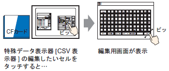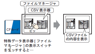 特殊データ表示器[ファイルマネージャ]と[CSV表示器]を使用して、外部ストレージ内のCSV形式のファイル(レシピデータ、アラーム履歴データ、サンプリングデータなど)の内容を表示器画面上に表示できます。表示器上でデータ内容を確認するのに使用します。