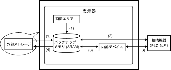 ファイリングデータを表示器内のバックアップメモリ(SRAM)と接続機器間で転送します。