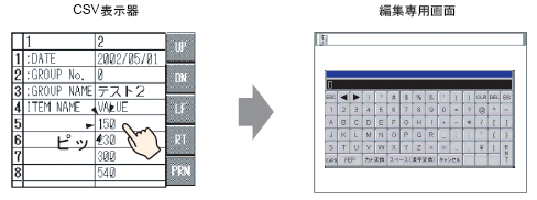特殊データ表示器[CSV表示器]の[データ編集]機能を設定している場合、表示されている各セルをタッチすることで自動的に編集用画面が表示されます。編集用画面上のキーボードをタッチして外部ストレージ内のデータを直接変更します。(キーボードは[表示言語]で[日本語]を選択している場合と、日本語以外を選択している場合で2種類用意されています。)