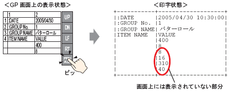 [印刷-全体]スイッチをタッチすると、画面に表示されていない部分を含めたCSVデータの全体を印字します。