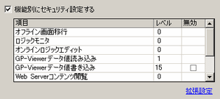 続いて[機能別にセキュリティ設定する]にチェックを入れ[項目]の操作に対し手順2で設定したレベルを設定します。(例 : [GP-Viewerデータ値読み込み]レベル「1」、[GP-Viewerデータ値書き込み]レベル「15」)