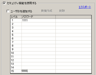 パスワード設定画面が開きます。[セキュリティ機能を使用する]にチェックを入れ、[レベル01]にパスワード「1111」を入力し、[レベル15]に「5555」を入力します。