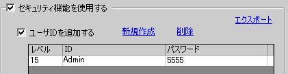 パスワード設定画面が開くので[セキュリティ機能を使用する]にチェックを入れ、[ユーザIDを追加する]にチェックを入れます。[新規作成]をクリックしてパスワード登録エリアを追加します。クリックごとに登録エリアが1つずつ追加されます。