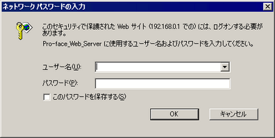 Enterキーを押すと表示器のWeb Serverに接続します。セキュリティ設定を行っている場合は次のような[ネットワークパスワードの入力]ダイアログボックスが表示されるので設定しているパスワードを半角英数8文字以内で設定し、[OK]をクリックします。