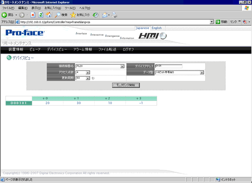 [デバイスビュー]の画面が表示されるので表示するデバイスアドレスの範囲、更新周期を設定します。表示するデバイスの[接続機器名]、[デバイスアドレス]、[アクセス点数]、[データ型]で設定し、またデバイスをモニタする周期を[更新周期]で設定します。[モニタリング開始]を選択するとモニタを開始し画面を表示します。
