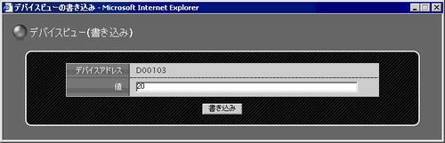 変更する値をクリックすると[デバイスビュー書き込み]ダイアログボックスが表示されるので変更する値を[値]に入力します。[書き込み]を選択すると設定した値が表示器に接続している接続機器に反映されます。(例 : [デバイスアドレス]D103、[値]20)